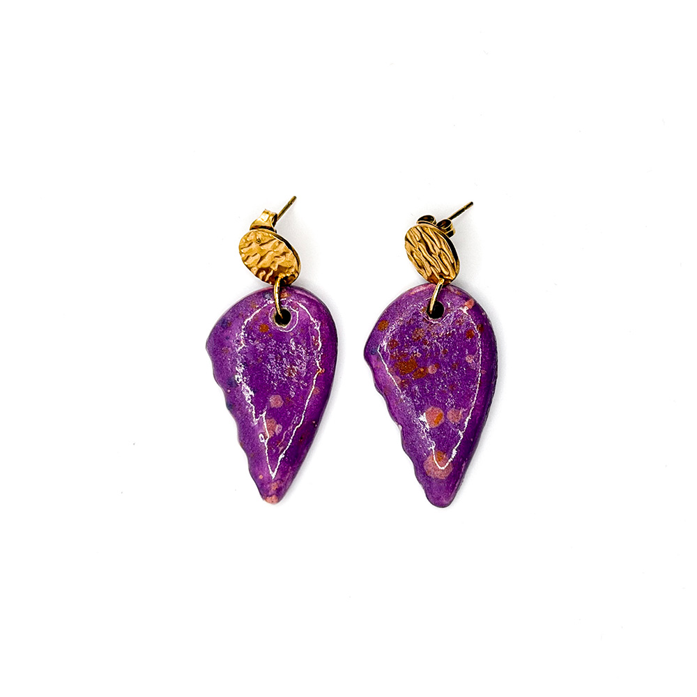 Pendiente en forma de medio corazón, de barro blanco, pintados bajo cubierta y cierre de acero inoxidable bañado en oro.