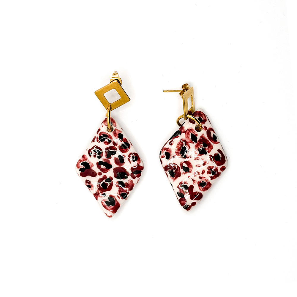 Pendiente en forma de rombo, de barro blanco, pintados bajo cubierta y cierre de acero inoxidable bañado en oro con detalle de rombo.